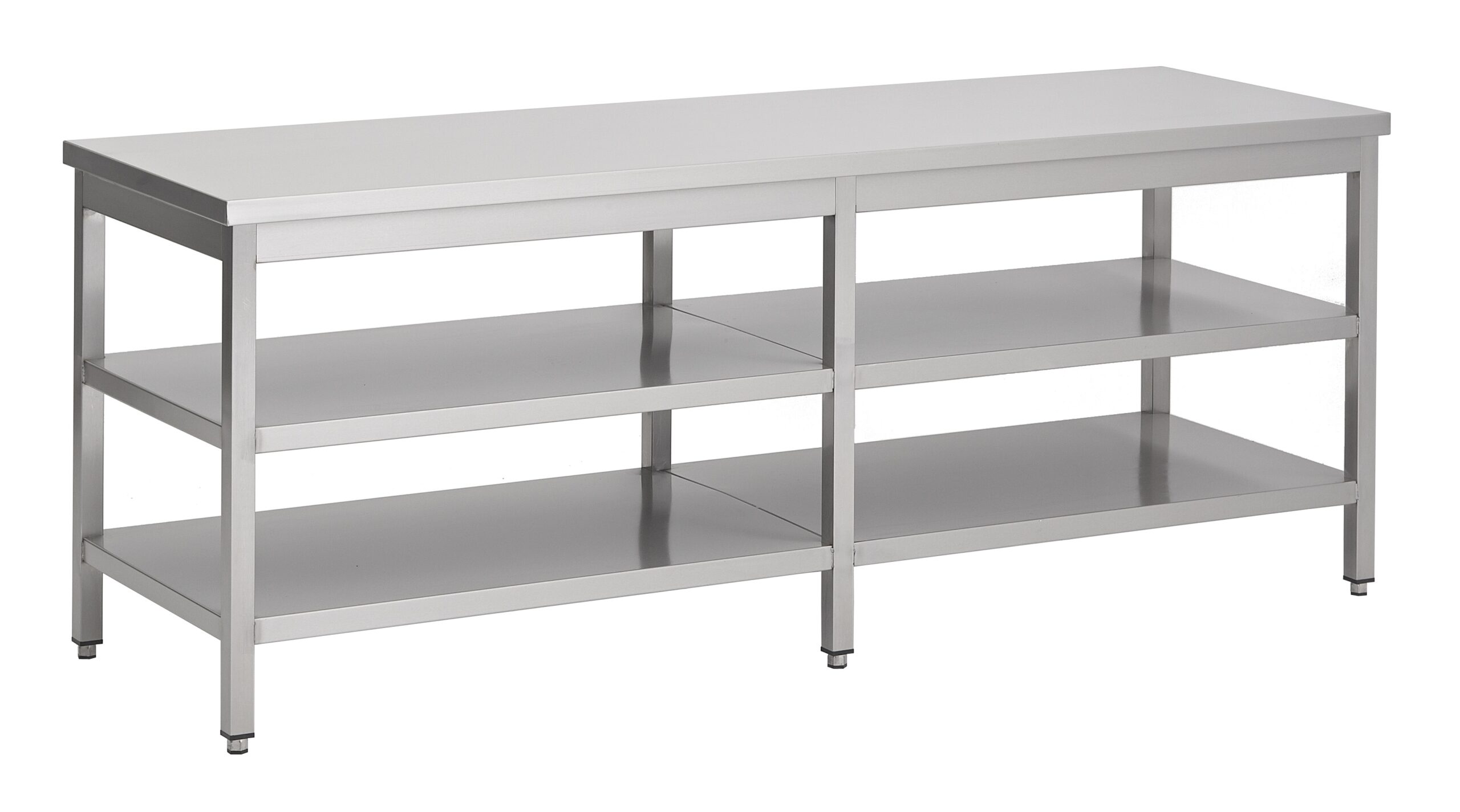 Ce plan de travail est conçu pour répondre aux exigences des cuisines professionnelles. Sa robustesse assure une durabilité accrue face à une utilisation intensive. Les dimensions généreuses de 700×2600 mm offrent une surface de préparation spacieuse et fonctionnelle. De plus, les deux étagères intégrées maximisent votre capacité de rangement. Ainsi, vous gardez vos ustensiles et ingrédients à portée de main.